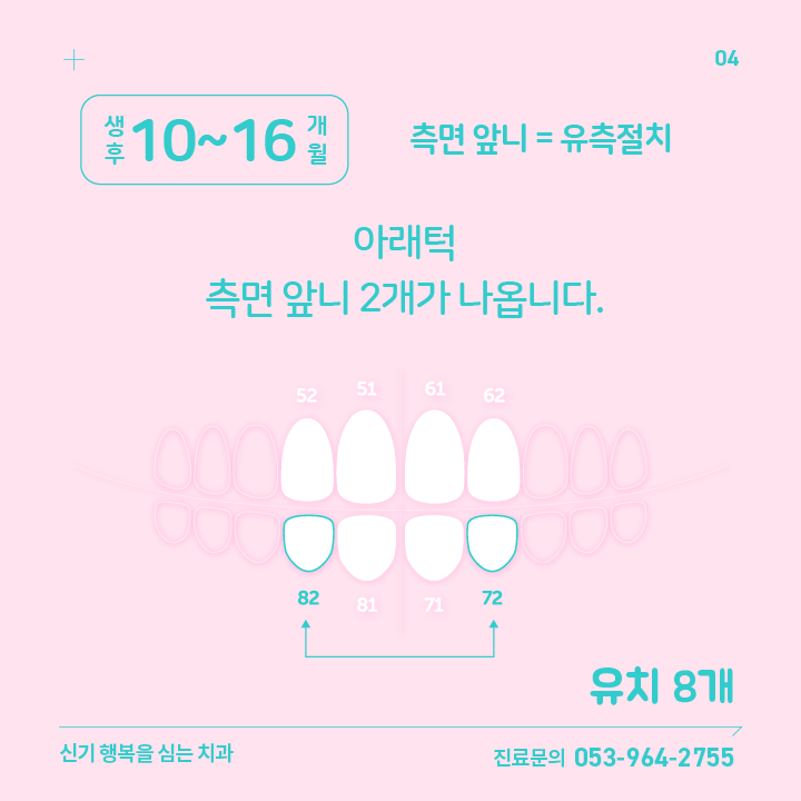 | 04 | 생후 10~16 개월 | 아래턱 측면 앞니 2개 | 72번, 82번 | |