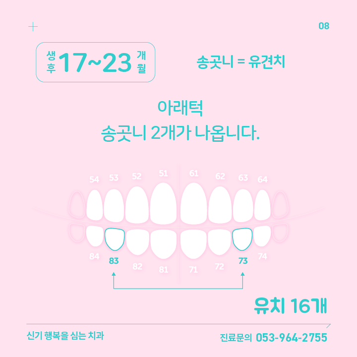 | 08 | 생후 17~23 개월 | 아래턱 송곳니 2개 | 73번, 83번 | |