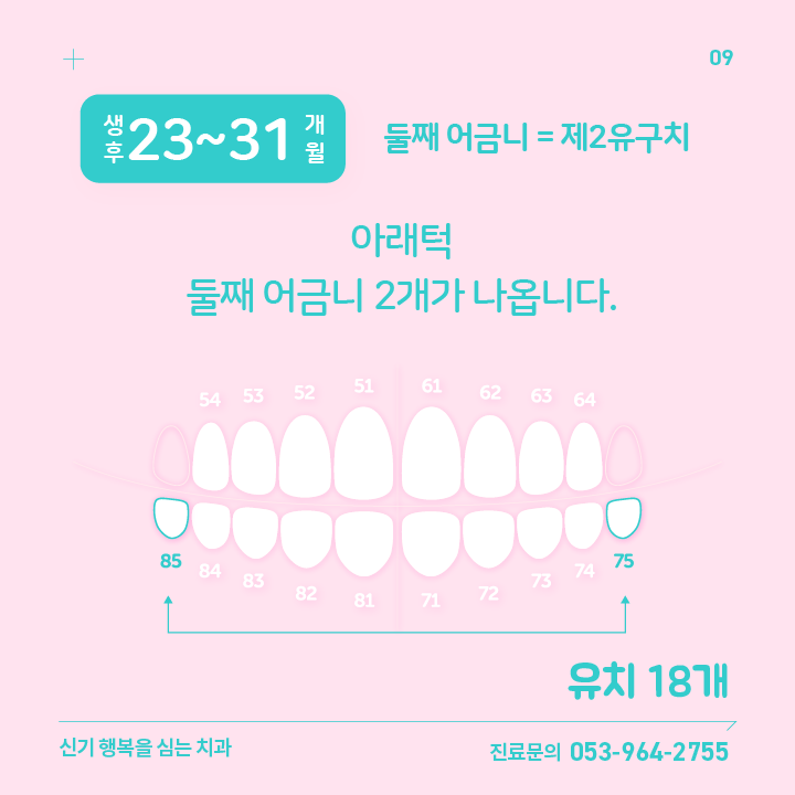 | 09 | 생후 23~31 개월 | 아래턱 둘째 어금니 2개 | 제2 유구치 | 75번, 85번 |