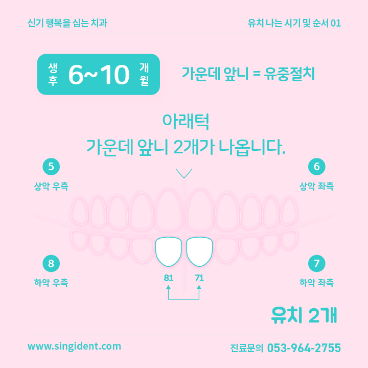 | 01 | 생후 6~10 개월 | 아래턱 가운데 앞니 2개 | 유중절치 | 71번, 81번 |