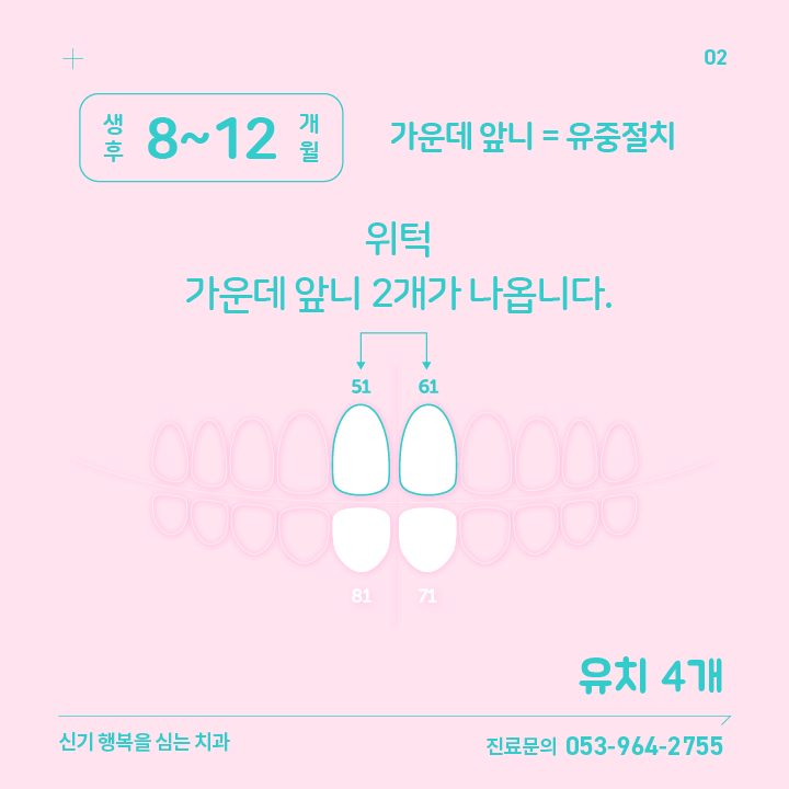 | 02 | 생후 8~12 개월 | 위턱 가운데 앞니 2개 | 51번, 61번 | |
