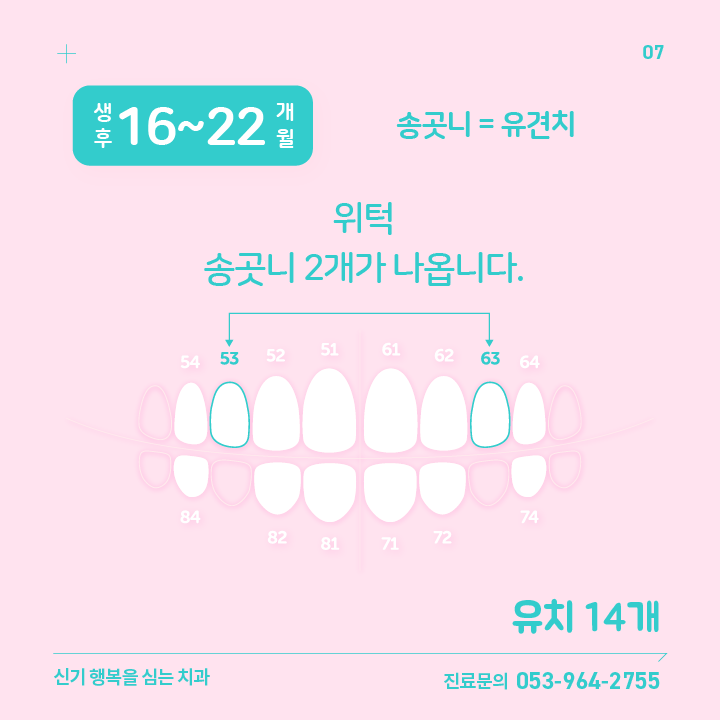 | 07 | 생후 16~22 개월 | 위턱 송곳니 2개 | 유견치 | 53번, 63번 |