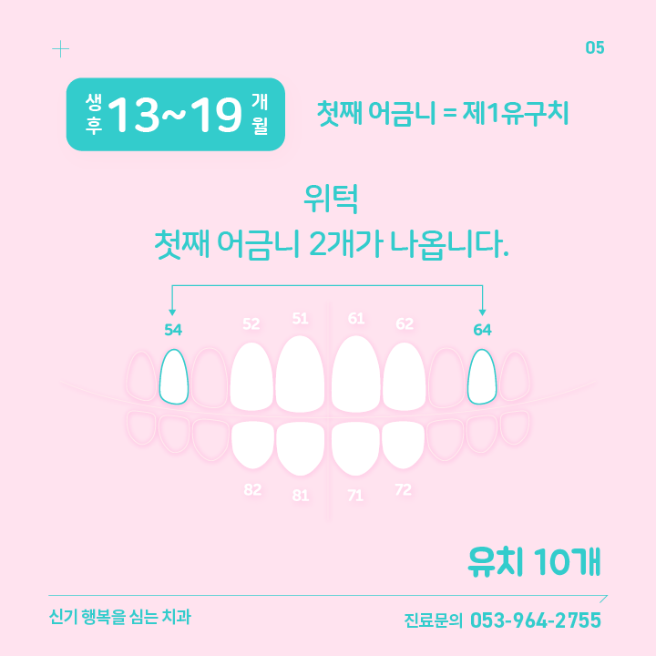 | 05 | 생후 13~19 개월 | 위턱 첫째 어금니 2개 | 제1 유구치 | 54번, 64번 |