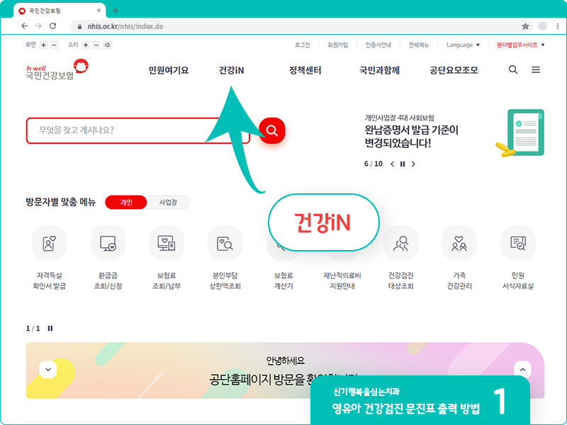 국민건강보험 홈페이지에 접속합니다. 홈 화면에서 상단 건강iN 메뉴를 클릭합니다.