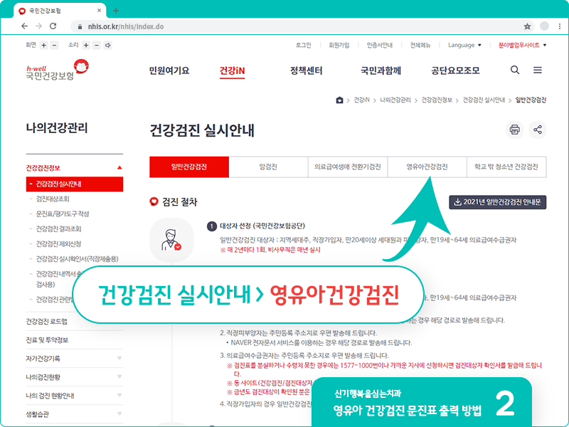 다음과 같이 '건강검진 실시안내' 페이지가 나타납니다. 여기에서 영유아건강검진 메뉴를 클릭합니다.