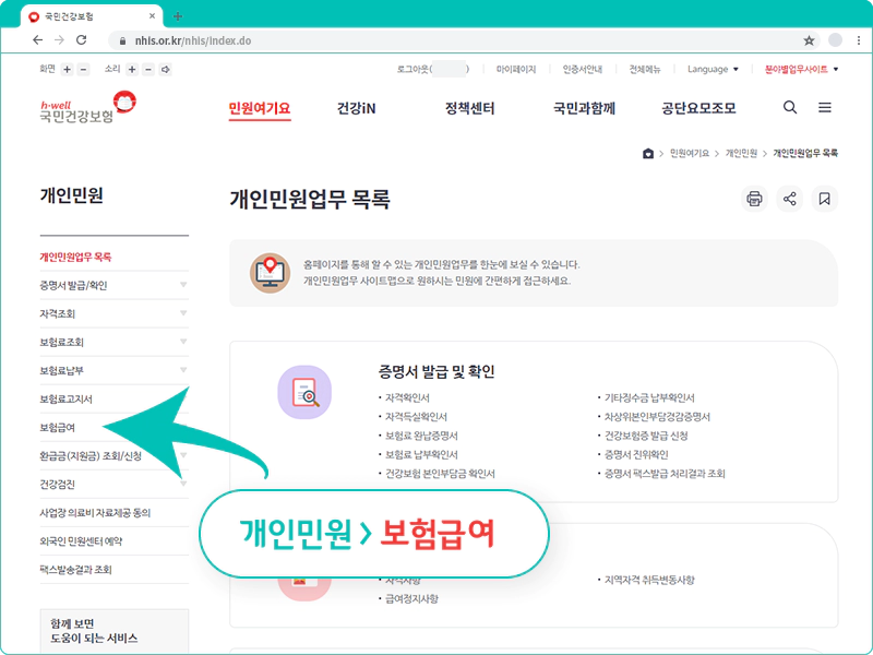 다음과 같이 개인민원 상세메뉴 중 '보험급여'를 클릭하세요.
