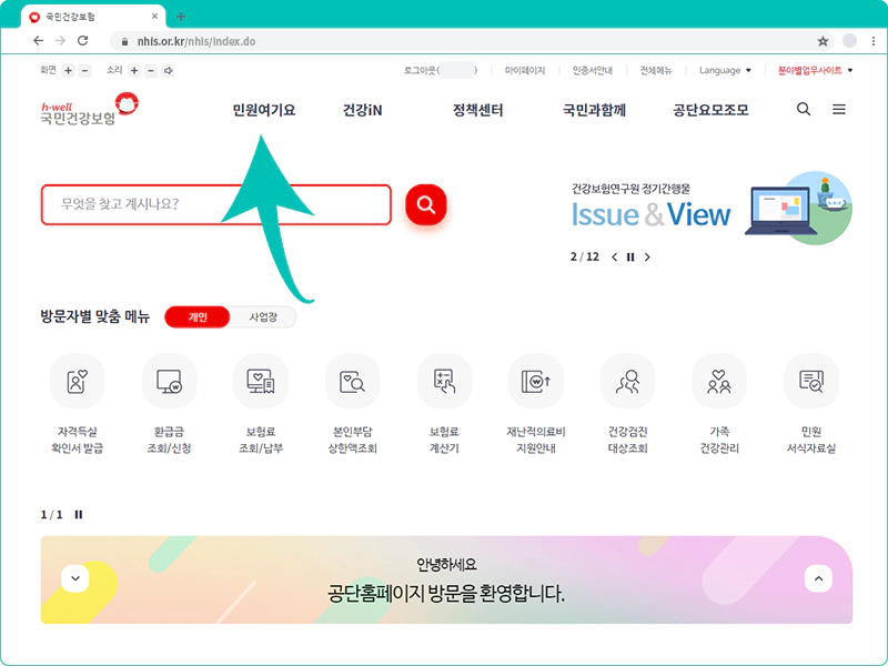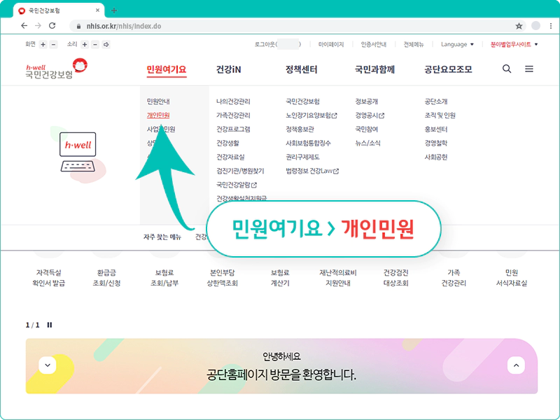 국민건강보험공단 홈페이지에 로그인 후 첫 화면입니다. 상단 첫 번째 메뉴 '민원여기요' 위로 마우스를 가져가면 상세 메뉴가 나타납니다.