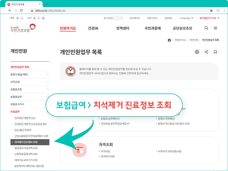 메뉴 위치 : 민원여기요 > 개인민원 > 보험급여 > 치석제거 진료정보 조회