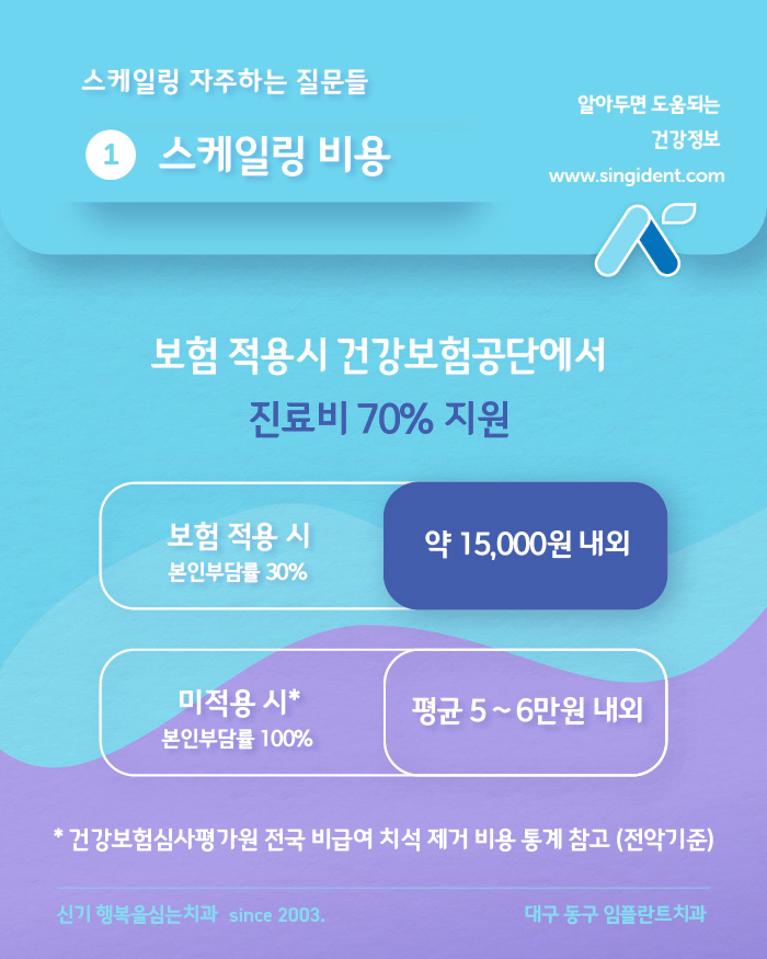 안녕하세요. 대구 동구 신기 행복을 심는 치과 전해드리는 치아 스케일링 정보입니다. 오늘은 치과 스케일링 비용과 보험적용 기준, 그리고 스케일링 시간, 주기, 통증, 마취 등 치석제거에 관해 자주 문의하시는 내용들을 안내해드립니다.