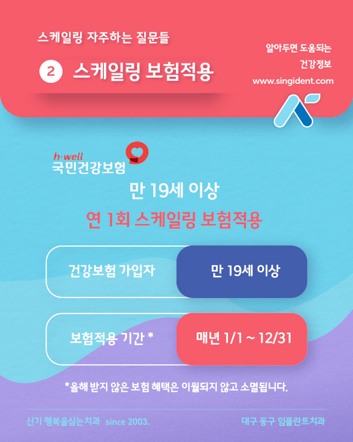 만 19세 이상이면 1년에 한 번 건강보험 적용을 받아, 건강보험공단으로부터 스케일링 비용 지원 혜택을 받을 수 있습니다. 스케일링 보험적용 기간 기준은 매년 1월 1일에서 12월 31일까지입니다.