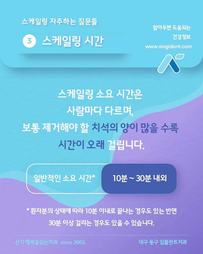 예를 들어, 정기적으로 스케일링을 받으시고 구강 관리를 잘하시는 분의 경우 5분 ~ 10분 이내에 스케일링이 끝나기도 합니다. 반면 구강 상태가 좋지 않고 제거해야 할 치석이 아주 많은 경우 30분 이상이 걸릴 수도 있습니다.