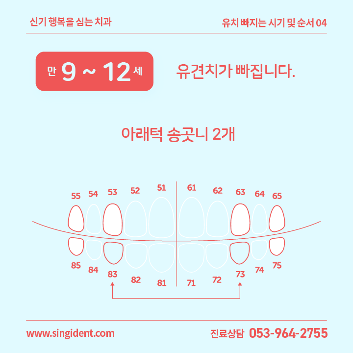 | 04 | 만 9세 ~ 12세 | 아래턱 송곳니 2개 | 총 2개 | 73번, 83번 |
