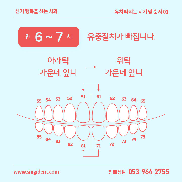 | 01 | 만 6세 ~ 7세 | 아래턱 가운데 앞니 2개 | 총 4개 | 71번, 81번 |