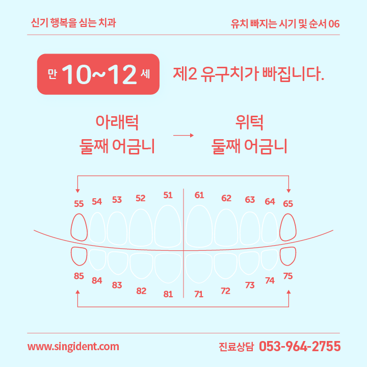 그리고 이 무렵 아래턱 둘째 어금니와 위턱 둘째 어금니 2개가 빠집니다. 참고로, 유치 둘째 어금니를 제2 유구치라고 합니다. 아래턱 제2 유구치 치아번호는 75번, 85번이며 위턱 제2 유구치는 55번과 65번 치아입니다.
