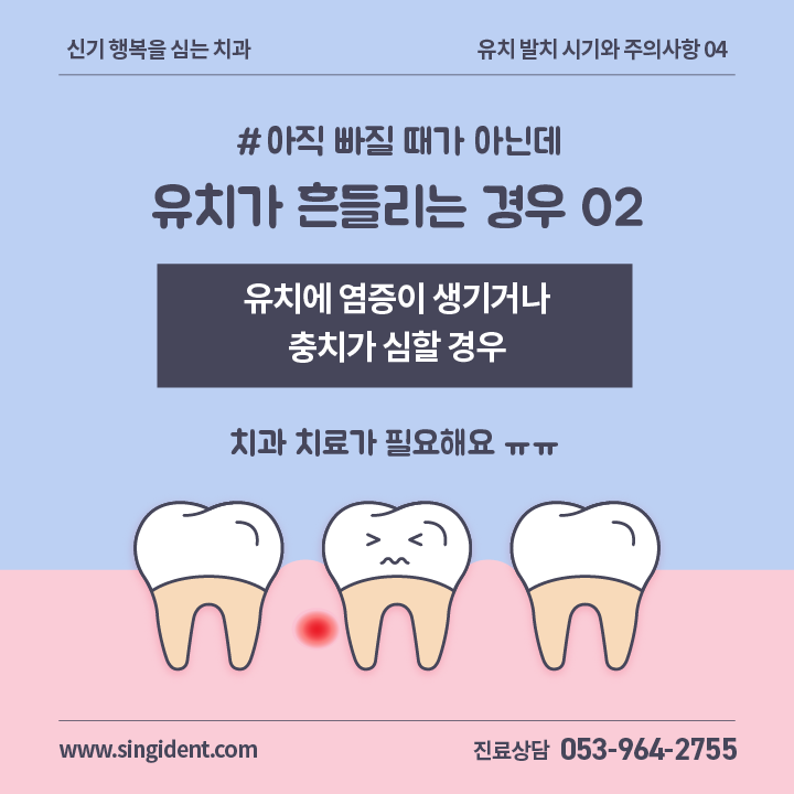 그밖에도 유치에 염증이 생기거나 충치가 심할 경우에 흔들릴 수도 있습니다. 이러한 경우 적절한 치과치료가 필요하니 치과에 가서 검진을 받아보시는 게 좋습니다.