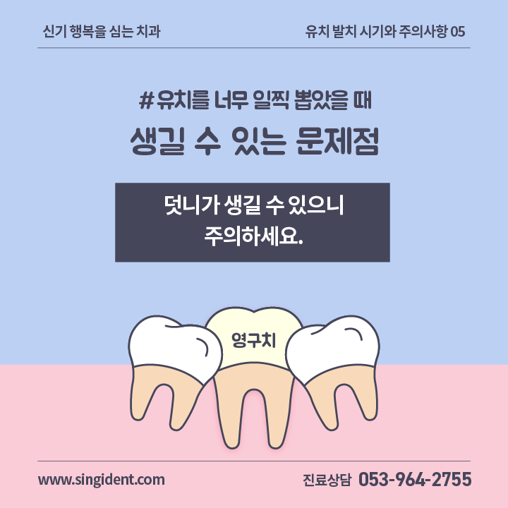 유치를 일찍 뽑아도 영구치는 영구치가 날 시기가 되어야 올라옵니다. 따라서, 유치를 너무 일찍 뽑으면 영구치가 날 때까지 그 공간이 비어있는 시간이 길어질 수밖에 없습니다.