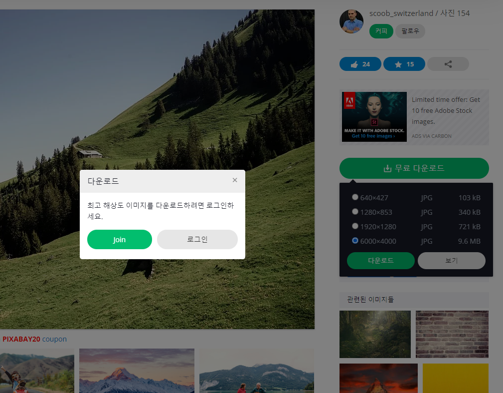 참고로, 최고 해상도 이미지는 회원가입 후 로그인해야 다운로드 할 수 있습니다. 이전에는 그냥 다운로드 받을 수 있었는데, 아마도 최근에 픽사베이 다운로드 정책이 변경되었나 봅니다.
