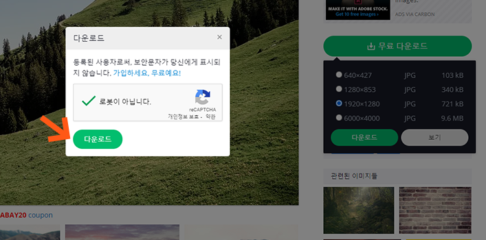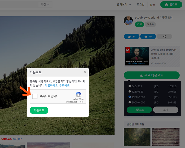 4. 다운로드 팝업창이 나타나면 '로봇이 아닙니다'를 체크합니다.