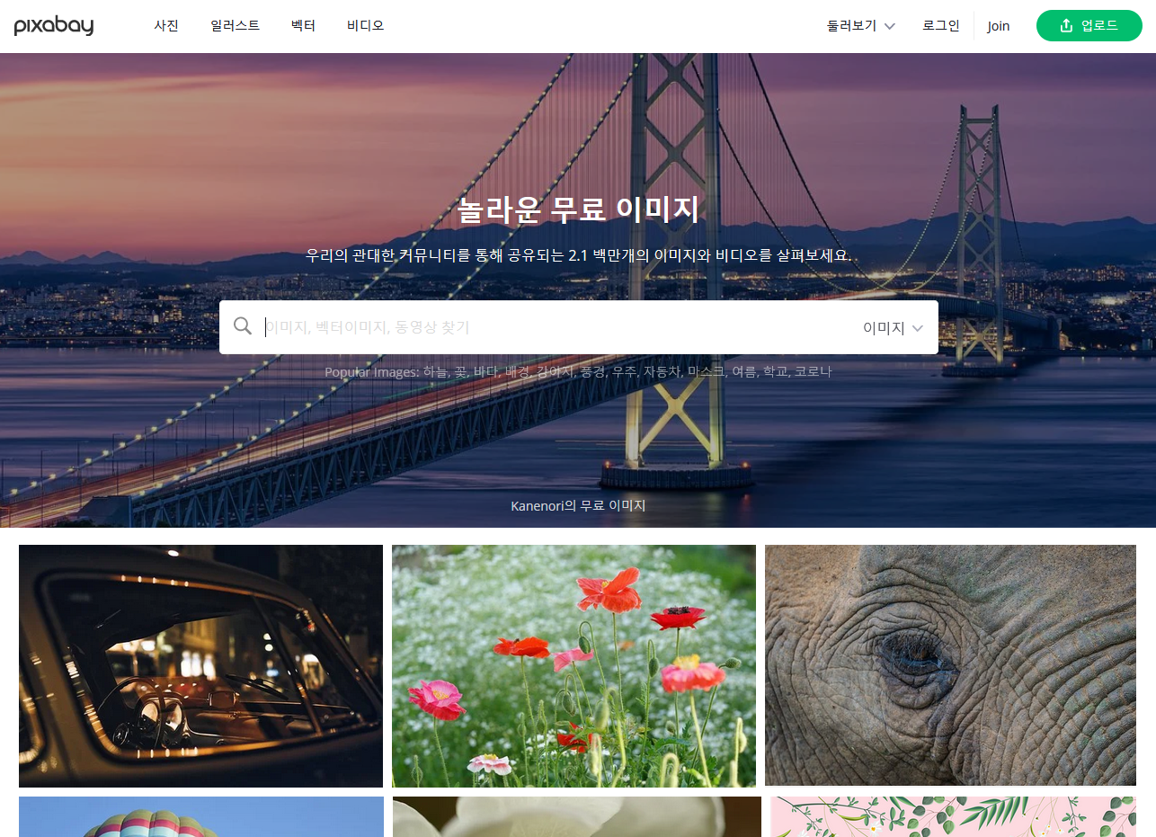 사진 이외에도 무료 벡터이미지와 일러스트, 비디오 등 다양한 종류의 무료 파일이 있습니다. 그리고 또다른 픽사 베이의 강점 중 하나는 한국어가 지원된다는 점이에요. 사이트에 한국어 지원이 되기 때문에 한글로 이미지 검색을 할 수 있습니다.