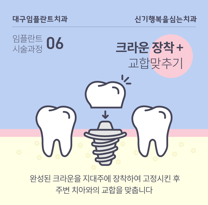 보철물이 완성되면 크라운을 임플란트 지대주에 장착하여 고정시킵니다. 그다음 음식을 씹을 때 불편함이 없도록 주변 치아와 새로 장착한 크라운의 교합을 조정합니다.