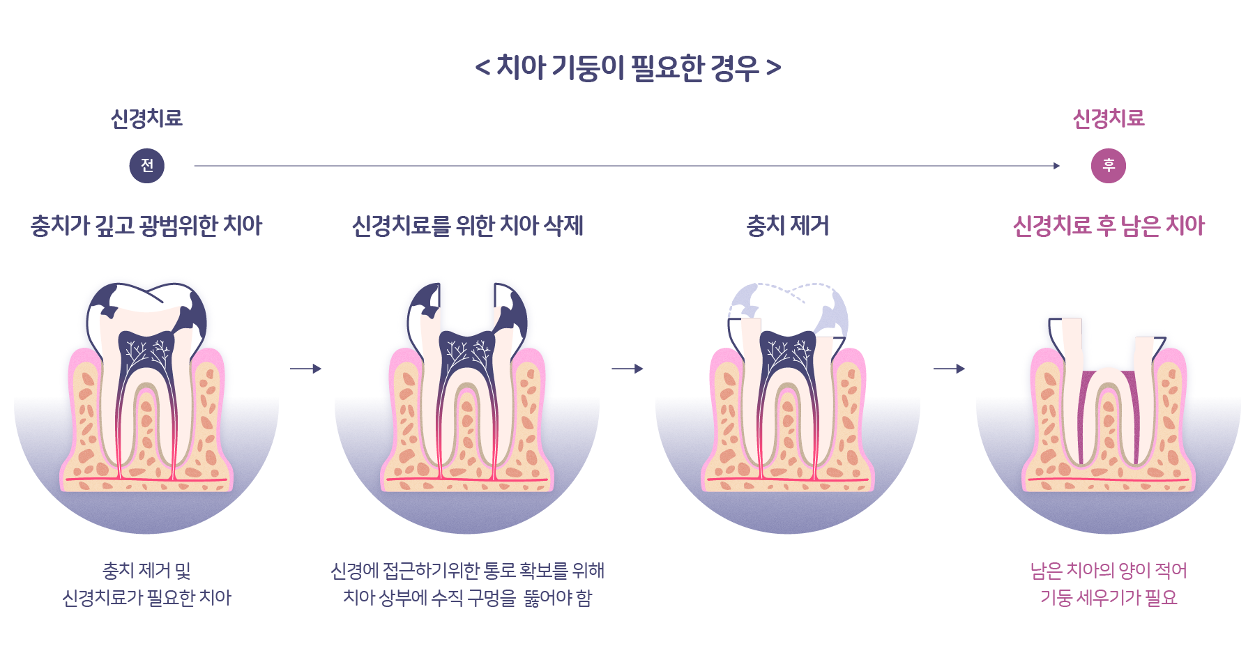 치과 신경치료 시 환자분의 치아 및 충치 상태에 따라 치아 삭제량이 달라지는데, 충치가 깊을수록, 충치 위치가 측면일수록 많은 양의 치아를 삭제할 수밖에 없습니다. 이렇게 치아 삭제량이 많은 경우, 크라운을 하더라도 구조적으로 힘을 잘 견딜 수 없기 때문에 치아 기둥이 필요합니다. 보통 남아있는 치관의 양이 1/3 이하로 적을 경우 기둥 세우기를 고려하게 됩니다.