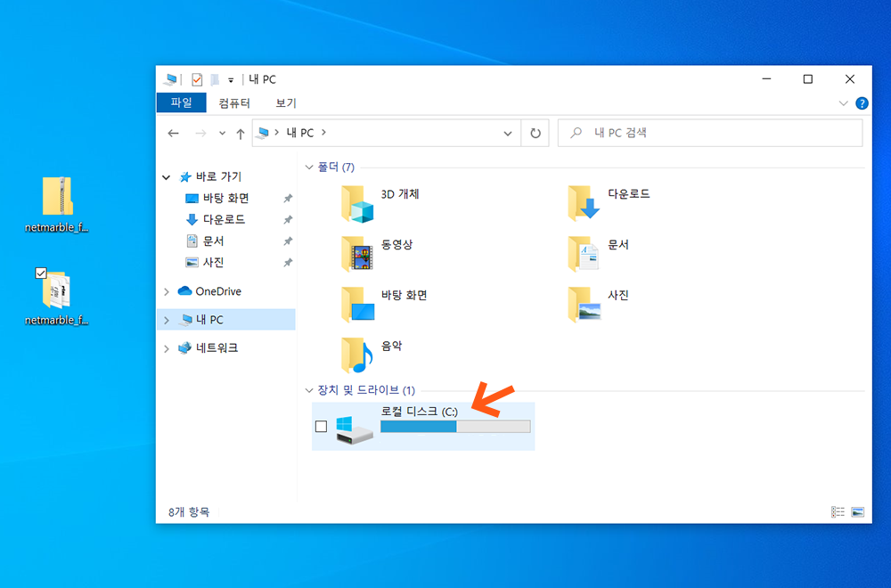 2> 장치 및 드라이브에서 윈도우10 운영체제가 설치되어있는 로컬 디스크(C:)를 클릭합니다.