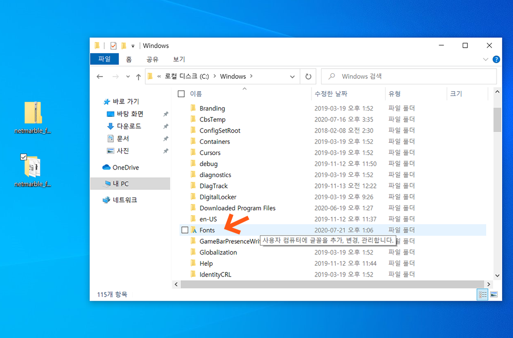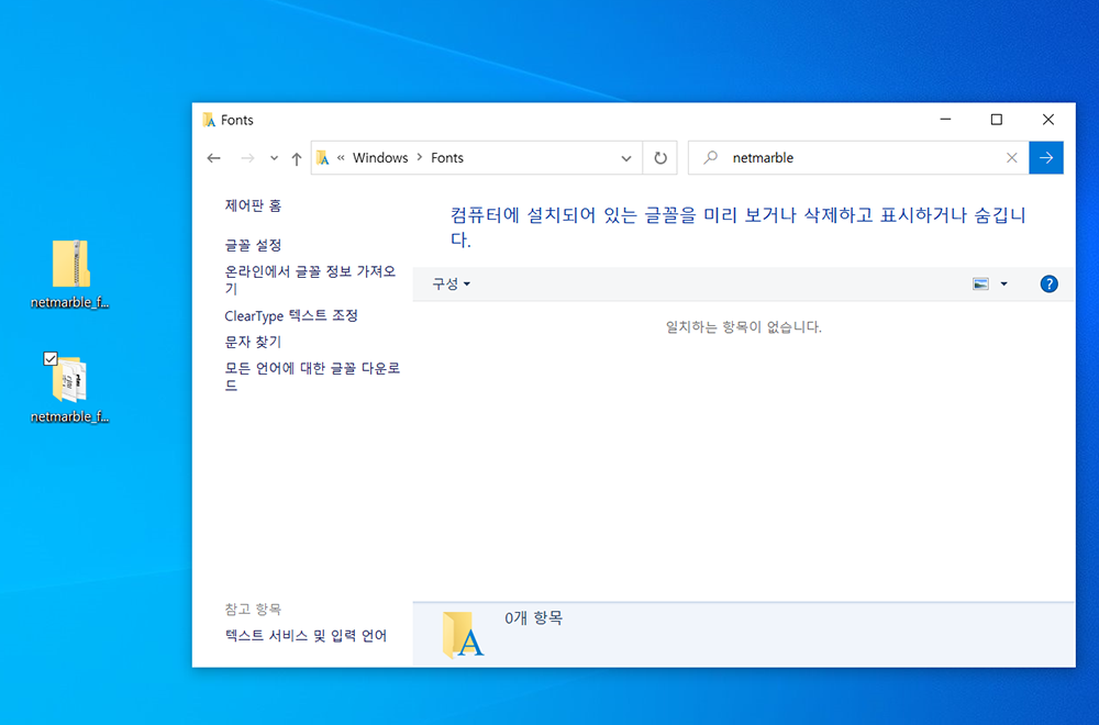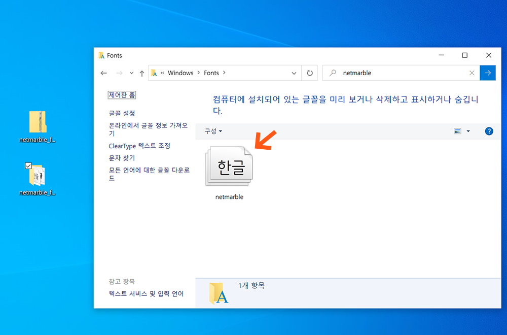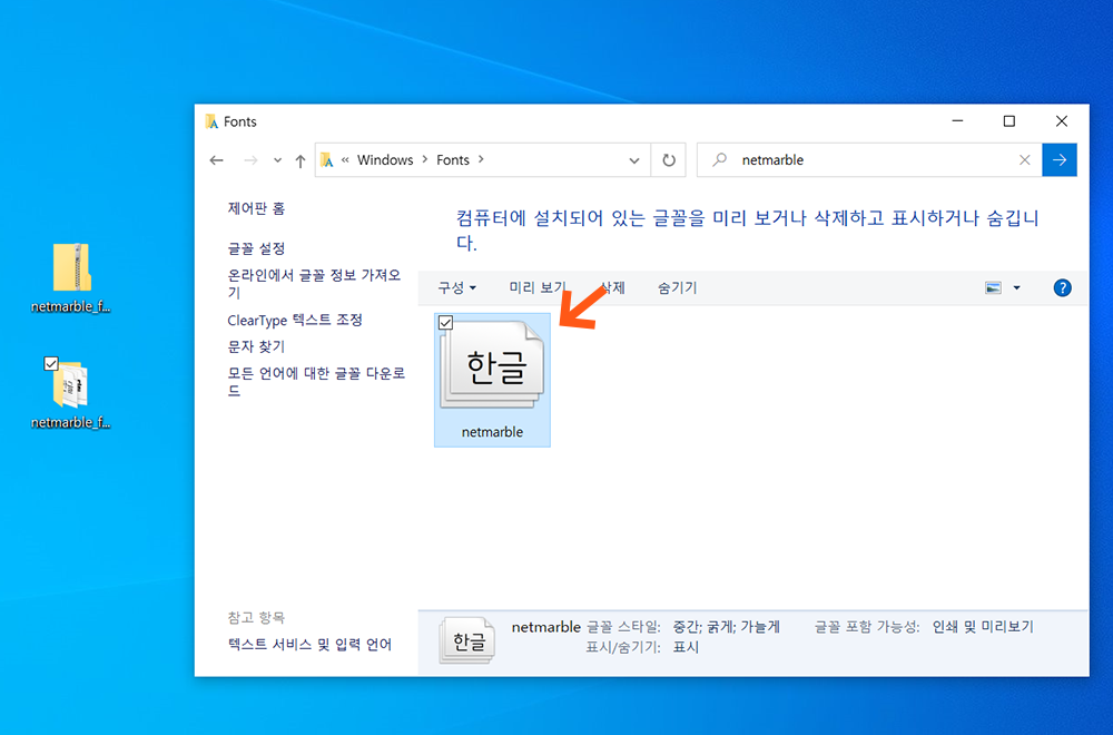 이로써 내 컴퓨터에 넷마블 폰트가 정상적으로 추가된것을 확인하실 수 있습니다.