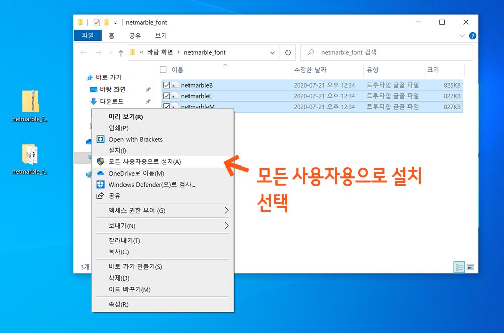 3> 압축을 푼 폴더를 열어 내 컴퓨터에 적용할 한글 글꼴 파일을 모두 선택합니다. 선택한 파일들 위에서 마우스 오른쪽 클릭합니다.