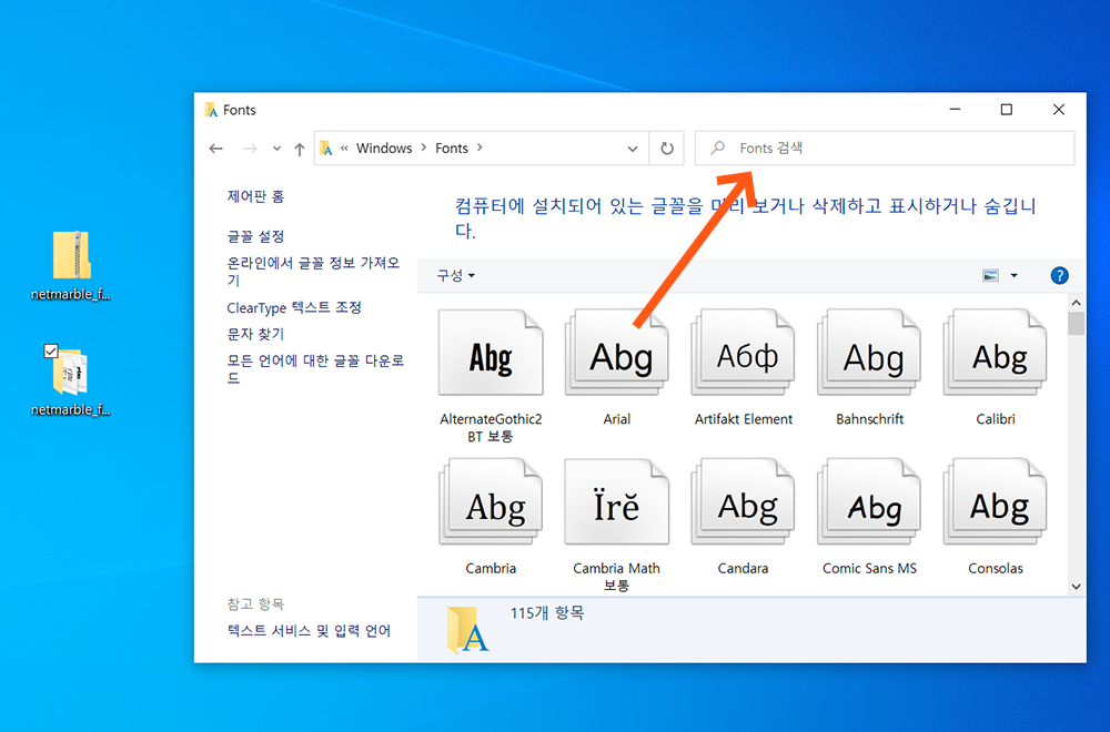 5> Fonts폴더 안에는 현재 내 컴퓨터에 설치되어 있는 모든 글꼴 파일이 들어있습니다. 이중에서 방금 설치한 넷마블 폰트를 찾기 위해 우측 상단의 'Fonts 검색' 상자를 클릭합니다.
