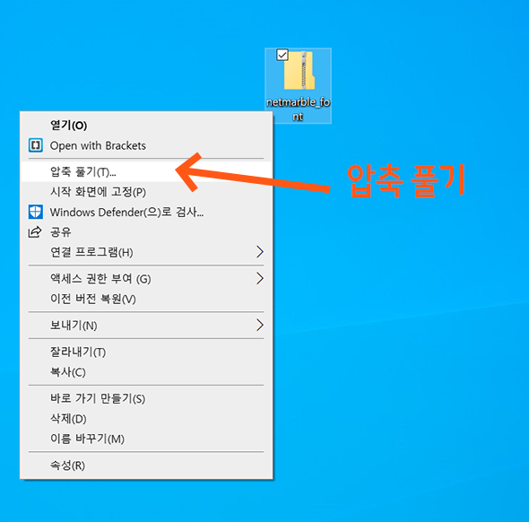 1> 우선 다운로드한 폰트 파일의 압축을 풀기를 합니다. 압축 파일을 선택한 다음 마우스 오른쪽 클릭 하면 아래 사진처럼 상세 메뉴가 나타납니다. 여기서 '압축 풀기'를 클릭합니다.