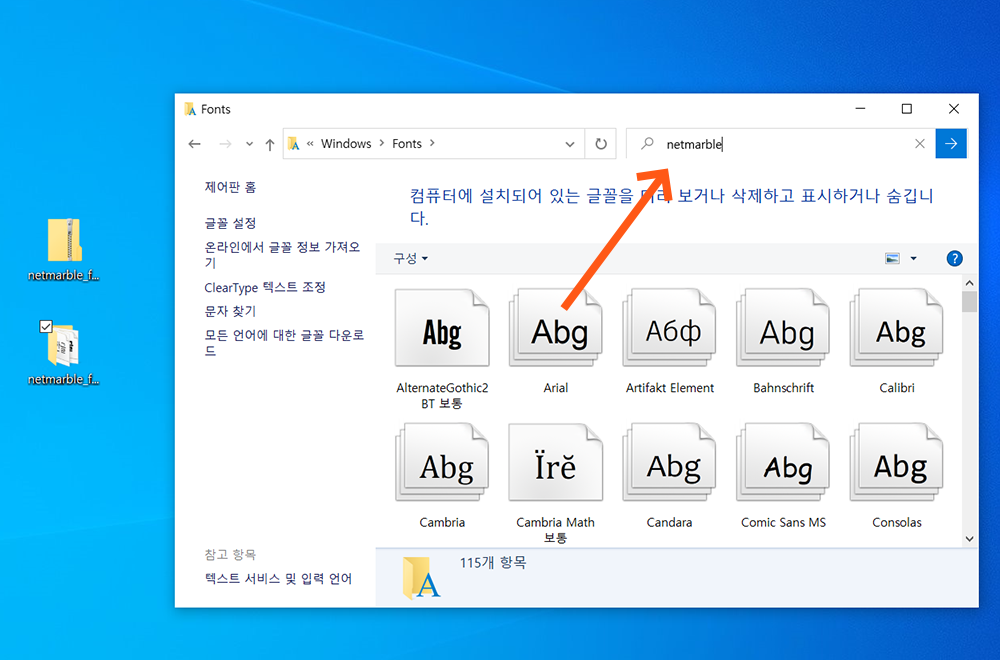 6> 검색 창에 넷마블 폰트 파일 이름 netmarble을 입력하고 엔터키를 누릅니다.