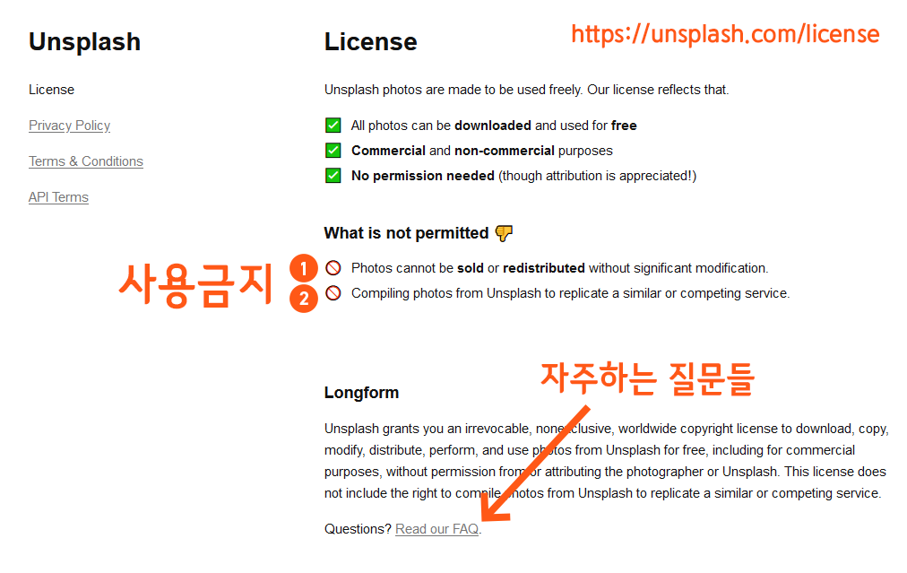 보다 구체적인 사용 예시는 언스플래쉬 라이선스 페이지 아래 부분의 자주 하는 질문(Read our FAQ)을 클릭하면 보실 수 있습니다.