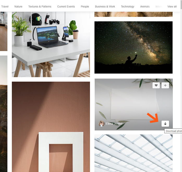 2. 다운로드할 사진 위에 마우스를 올리면 다음과 같이 오른쪽 아래 코너에 화살표 버튼이 나타납니다.