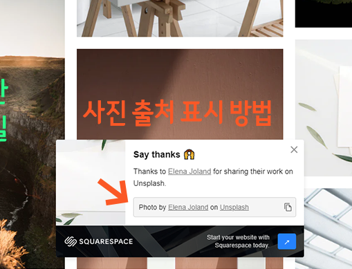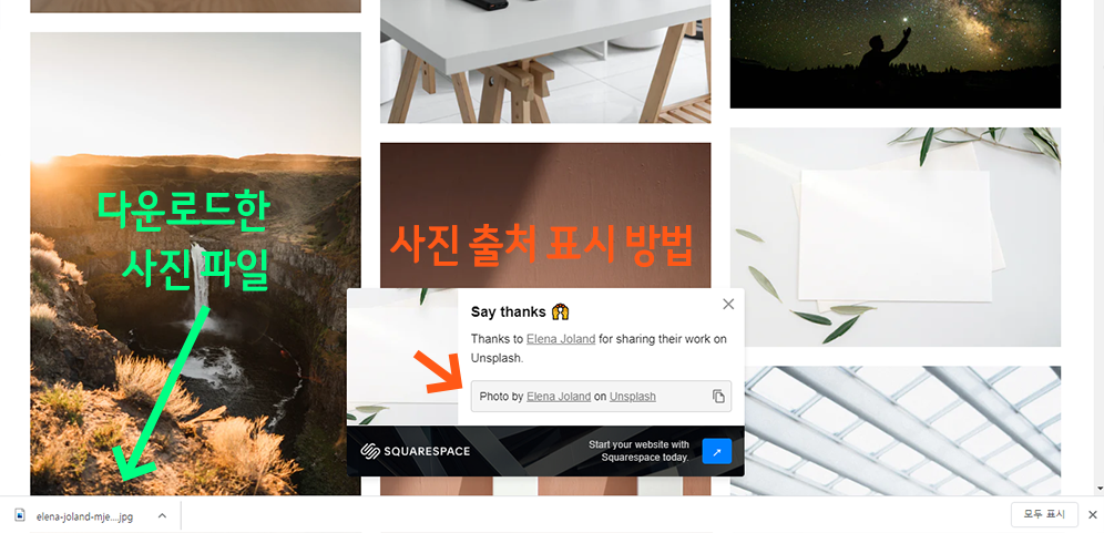 사진을 다운로드하면 아래의 사진에서 처럼, Say thanks라는 조그만 팝업창이 나타납니다. 언스플래쉬 사진 사용 시 출처를 표기를 안 해도 상관없지만, 무료 사진을 공유해준 작가에게 감사의 표시로 출처 표기를 해주는 게 권장되기는 합니다. 이때 출처 표시 방법은 팝업창에 나타난 설명처럼 Photo by 사진작가 이름 on Unsplash로 하면 됩니다. 글씨 옆에 파일 아이콘을 클릭하면 해당 출처 정보가 자동으로 클립보드에 저장됩니다.