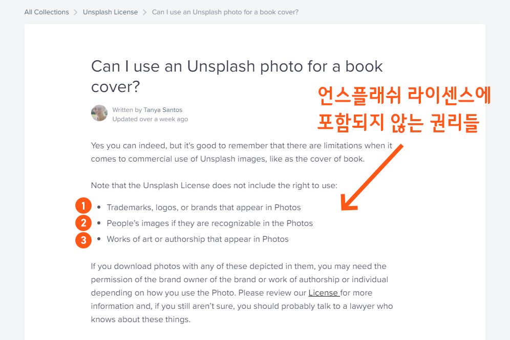 예를 들어 언스플래쉬 사진을 판매용 도서 북커버로 사용할 수 있냐는 질문이 있습니다. 네, 판매용 도서 커버 이미지로 사용할 수 있다고 합니다. 다만 여기서 주의할 내용이 있는데요, 언스플래쉬 라이선스는 다음의 경우에 대한 권리는 포함하고 있지 않다고 합니다.