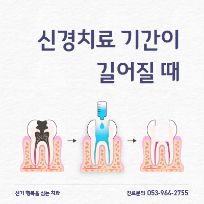 대구 동구 신기 행복을심는치과에서 전해드리는 치아 신경치료 이야기입니다. 오늘은 일반적인 신경치료 기간과 신경치료가 길어질 때 등 치아 신경치료에 걸리는 기간에 대해 좀 더 상세히 알려드립니다.