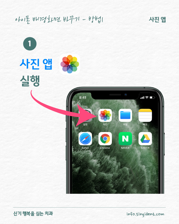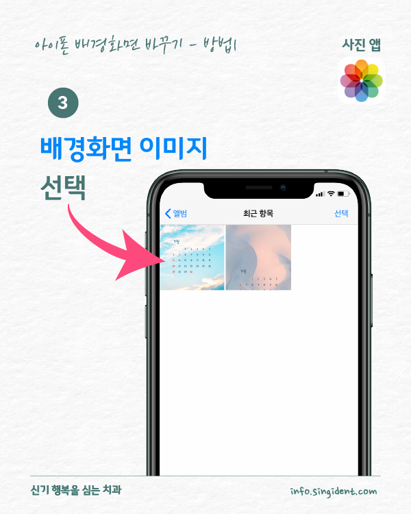 안녕하세요. 대구 동구 신기 행복을 심는 치과에서 전해드리는 생활정보 이야기입니다. 이번 포스팅에서는 내가 찍은 사진 혹은 인터넷에서 다운로드한 사진 이미지로 아이폰 배경화면을 바꾸는 방법에 대해 알려드립니다.