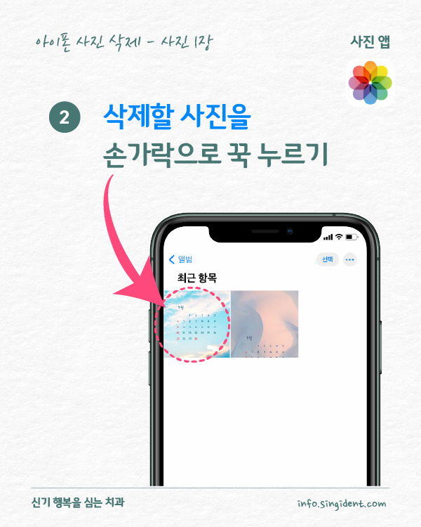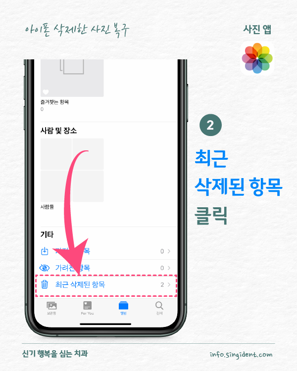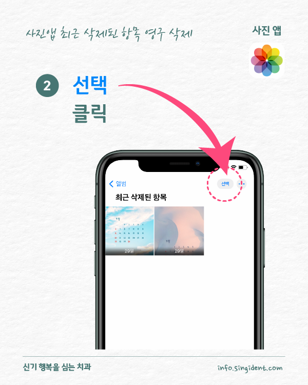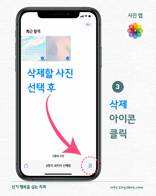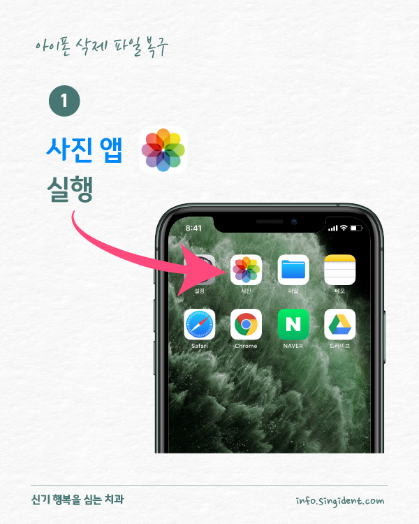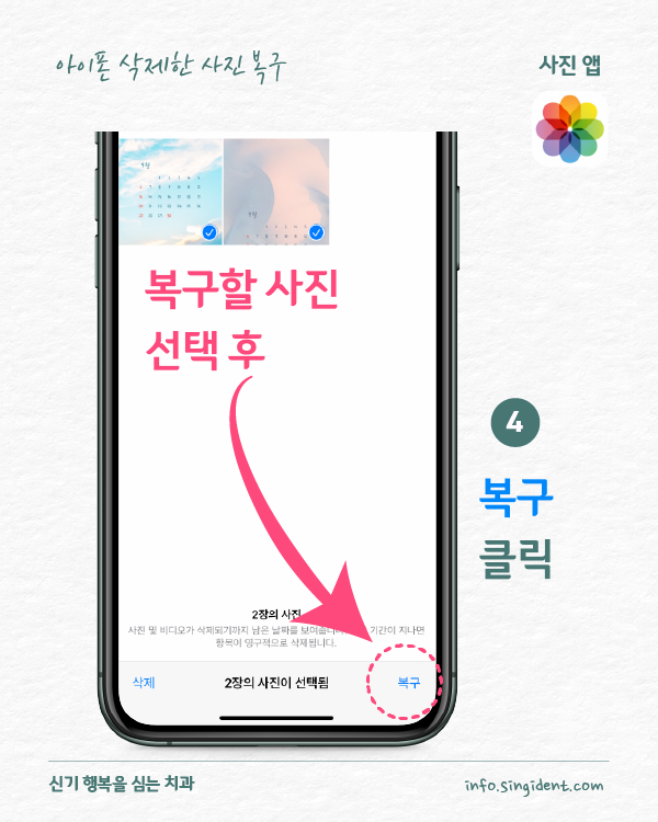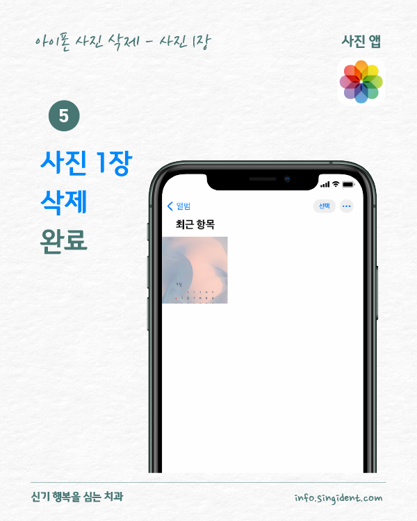 안녕하세요. 대구 동구 신기 행복을 심는 치과에서 전해드리는 생활정보, 아이폰 사용법입니다. 오늘은 아이폰 사진 앱에서 사진 삭제 및 복구하는 방법 그리고 최근 삭제된 항목에 저장된 사진을 완전히 삭제하는 방법 대해 알려드립니다.