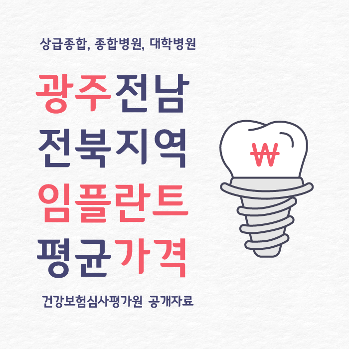 이 글에서 알려드리는 임플란트 가격은 건강보험심사평가원에서 2021년 9월 29일 공개한 자료 중 전라북도, 전라남도, 광주광역시 지역 평균 임플란트 가격과 이 지역 소재 종합병원과 대학부속 치과병원에서의 임플란트 최저, 평균, 최고 가격을 천단위 절사하여 보기 편하게 표로 정리한 자료입니다.
