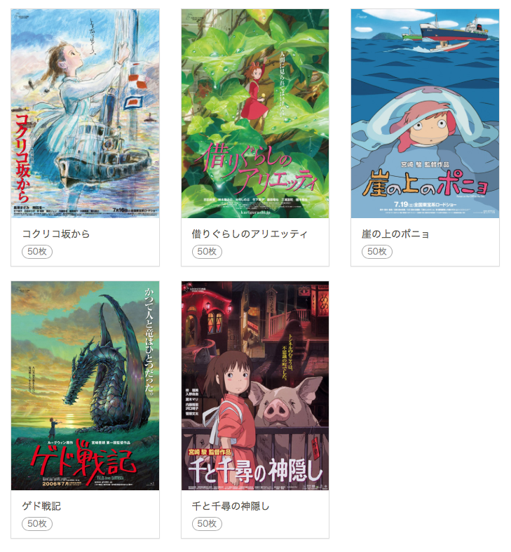 8개의 작품은 '추억의 마니, 2014', '가구야 공주 이야기, 2013', '바람이 분다, 2013', 코쿠리코 언덕에서, 2011' '마루 밑 아리에티, 2010', '벼랑 위의 포뇨, 2008', '게드전기, 2006', '센과 치히로의 행방불명, 2001'입니다. 총 400장의 이미지, 그러니까 각 작품 하나 당 50개의 이미지를 제공하고 있습니다.