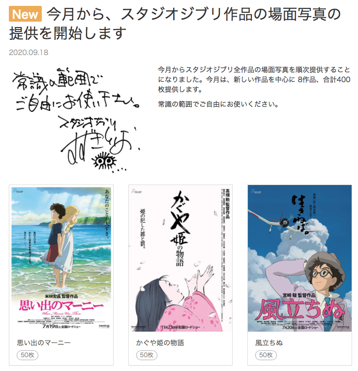 글 내용 : 이달부터 스튜디오 지브리 전 작품의 장면 사진을 순차적으로 제공할 수 있게 되었습니다. 이번 달에는 새로운 작품을 중심으로 8 작품 총 400 개 제공합니다. 상식의 범위에서 자유롭게 사용하십시오.