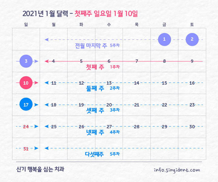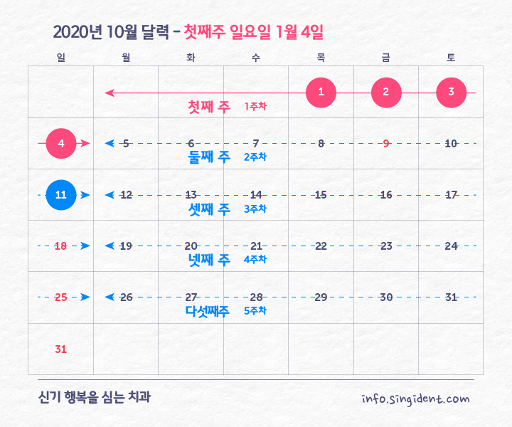 안녕하세요. 대구 동구 임플란트 치과, 신기 행복을 심는 치과에서 전해드리는 생활정보 이야기입니다. 오늘은 은근히 헷갈리는 매월 첫째 주 기준과 한주의 시작은 일요일인지 월요일인지에 대해 설명해드립니다.