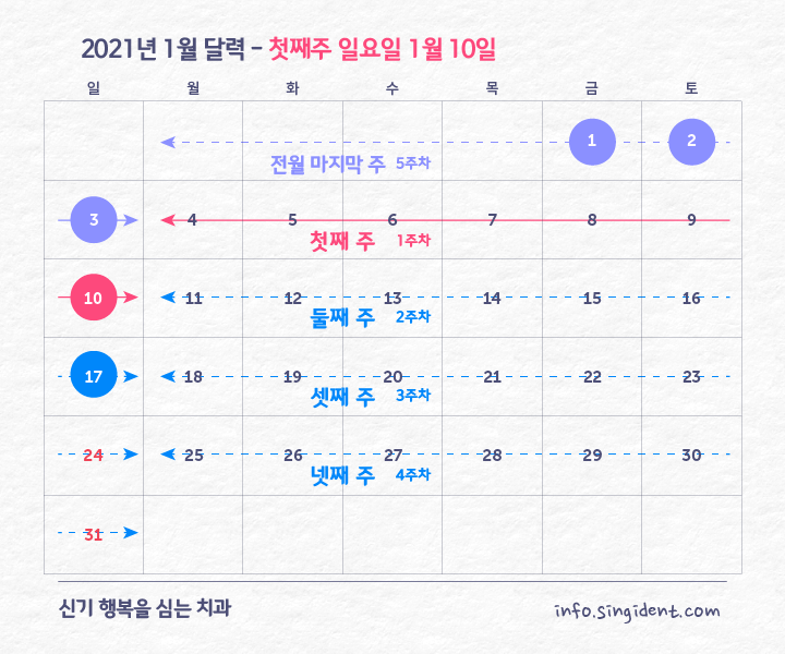 좀 더 이해가 쉽게 2021년 1월 달력을 기준으로 설명드리겠습니다.