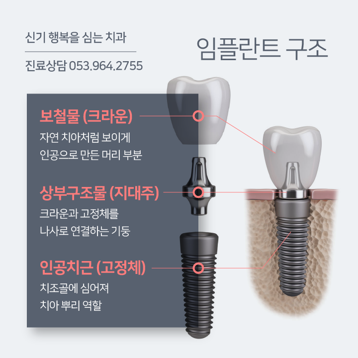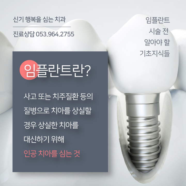 대구 동구 임플란트 치과, 신기 행복을 심는 치과에서 전해드리는 임플란트 이야기입니다. 오늘은 임플란트란 무엇인지 그리고 임플란트 시술 전 알아야 할 기초적인 내용들에 관해 알려드립니다.