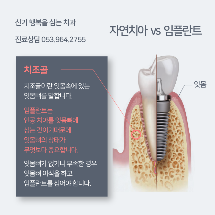 자연 치아가 잇몸뼈에 심겨져 있는 것처럼, 임플란트도 인공 치아를 잇몸뼈에 심게 됩니다. 따라서 임플란트 시술시 잇몸뼈의 상태가 무엇보다 중요합니다.