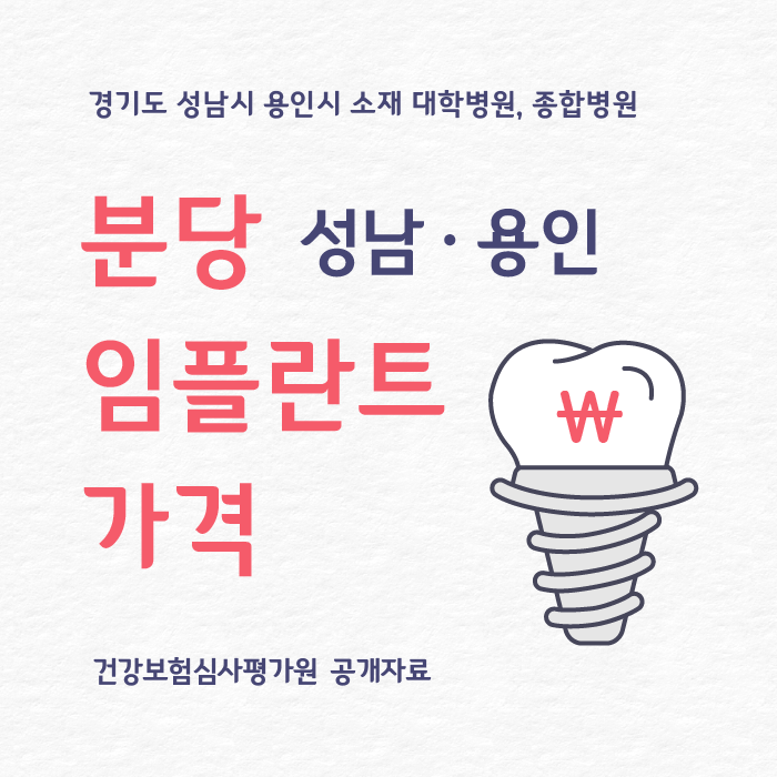 이 글에서 알려드리는 임플란트 가격은 건강보험심사평가원에서 2021년 9월 29일 공개한 자료 중 분당, 성남시, 용인시 지역 소재 상급종합병원, 종합병원 그리고 대학 부속 치과병원에서의 임플란트 최저, 평균, 최고 가격을 천 단위 절사 하여 보기 편하게 표로 정리한 자료입니다.