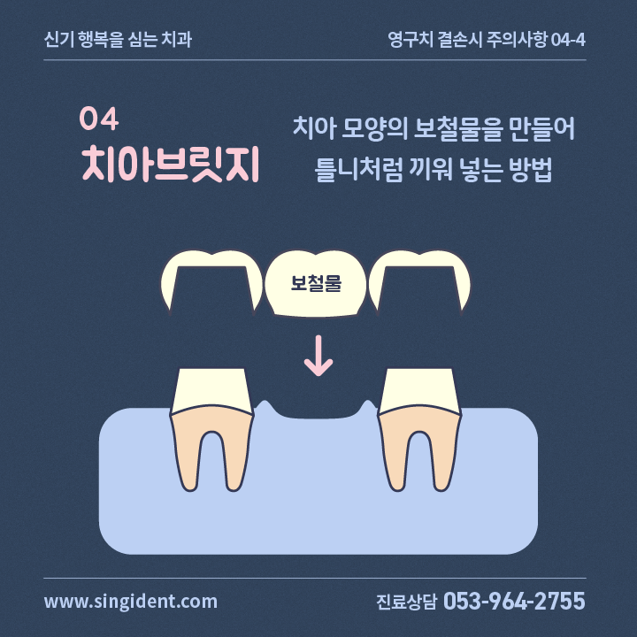- 치아가 없는 빈 공간으로 주변 치아들이 쏠려 부정교합이나 치열이 흐트러지는 등의 문제를 일으킬 수 있습니다.