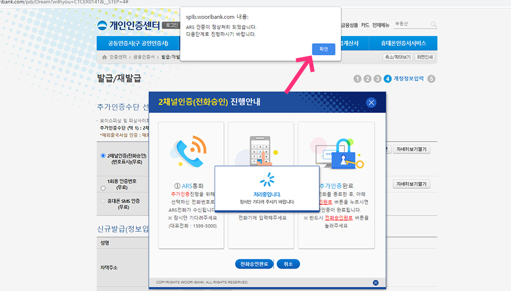 페이지 상단에 ARS 인증이 정상 처리되었다는 팝업창이 나타납니다. '확인'을 클릭하세요.