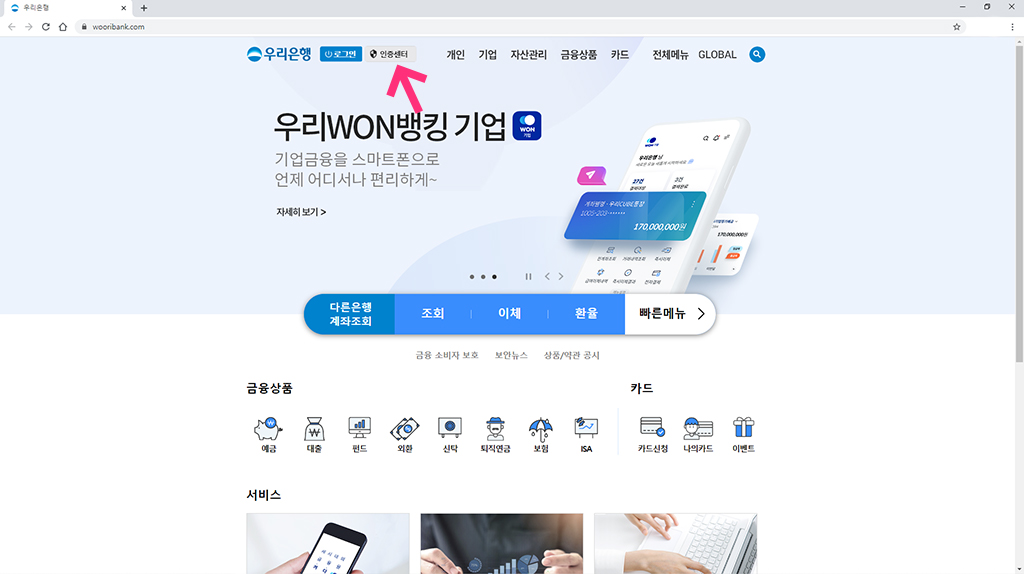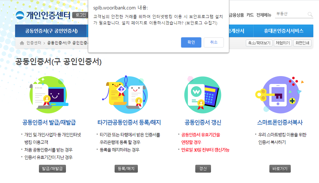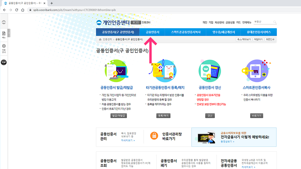 Step 1. 우리은행 홈페이지 → 개인 인증센터 → 금융인증서 페이지 접속