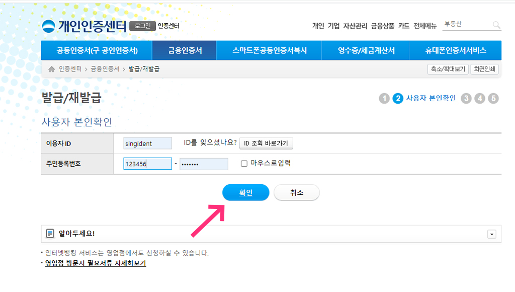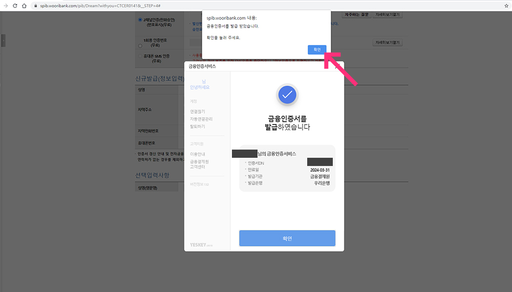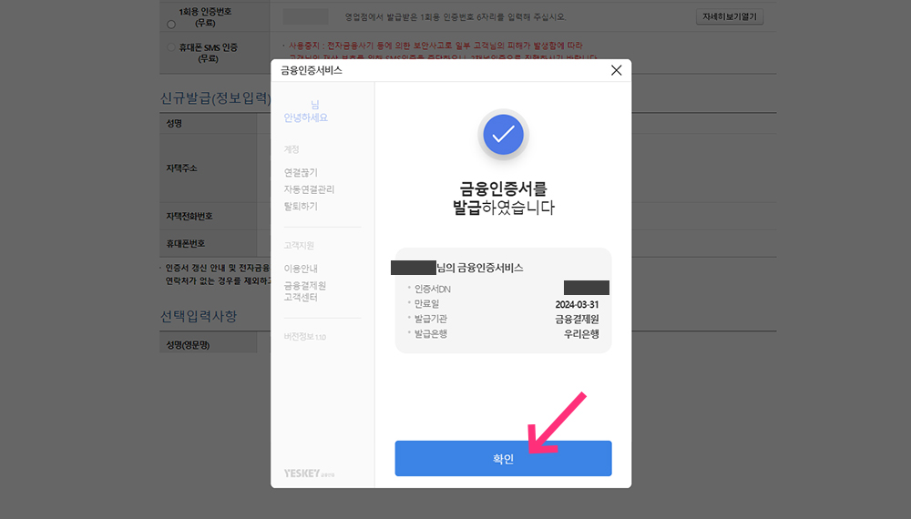다음과 같이 '금융인증서를 발급하였습니다.'라는 내용이 나타나면 밑에 '확인' 버튼을 누르세요.